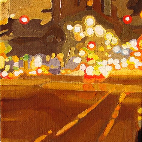 Three dozen or so five-inch square canvases that appear to be painted from blurry photosdoesnt sound very promising, does it? But in its deft way, Kate Protages XS is better than almost anything else in Pioneer Square right now (also kicking major ass are Jeffry Mitchell with his wild pots at James Harris and Doug Parry with his vignettes of clown-dads ‘n nooses at Marni Muir). Most other shows have responded to the crisis of a shrinking market by cycling through the usual exhausted tropes even more frantically. There are taxonomic displays, campy appropriations of vintage illustration, and indie cutesiness. Galleries like Grover Thurston that have always unabashedly targeted upscale living rooms are now approaching Restoration Hardware-levels of harmless charm. XS (extra small or excess?) is by contrast sober, agile, and alert. The magic of the paintings (entirely lost in reproduction, sorry) is in how a few sharp-edged blobs of paint can so economically transmit an atmosphere of nocturnal mystery, and so precisely indicate the side of a bus, a haze of light from a storefront, or a couple standing in the shadows. The artists sharp watchfulness also seems to be finely tuned to the current market. At $125 a painting, the show is a near sellout. DAVID STOESZ