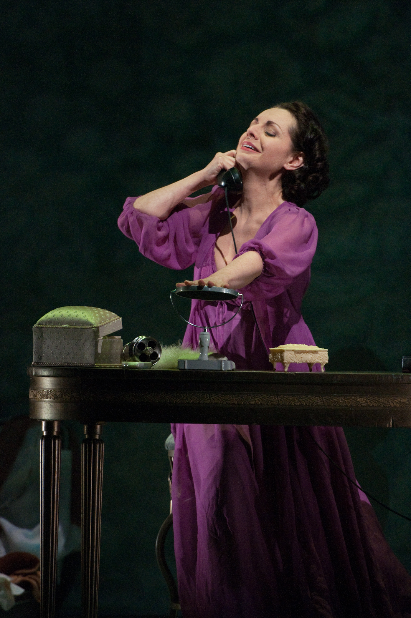 This all-woman double bill—the only male voices you hear are those in the backstage choir at Angelica’s climax—opens with Francis Poulenc’s 1959 monodrama La voix humaine (“The Human Voice”), an idea that shouldn’t work at all: Jean Cocteau’s libretto portrays one side of a 40-minute phone conversation between a woman and her unseen lover, who, we gradually gather, is breaking things off. You can’t blame him; you know the woman, identified only as “Elle” (“She”), is nuts from the way soprano Nuccia Focile neurotically strokes the phone like a pet cat, even before she admits to her lover she almost stalked him to his apartment and later took a dozen sleeping pills.
