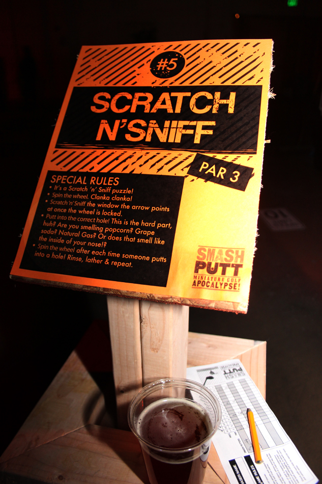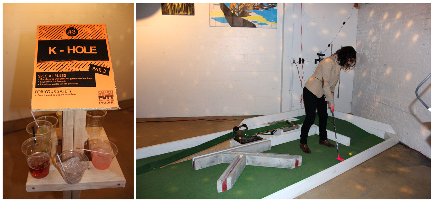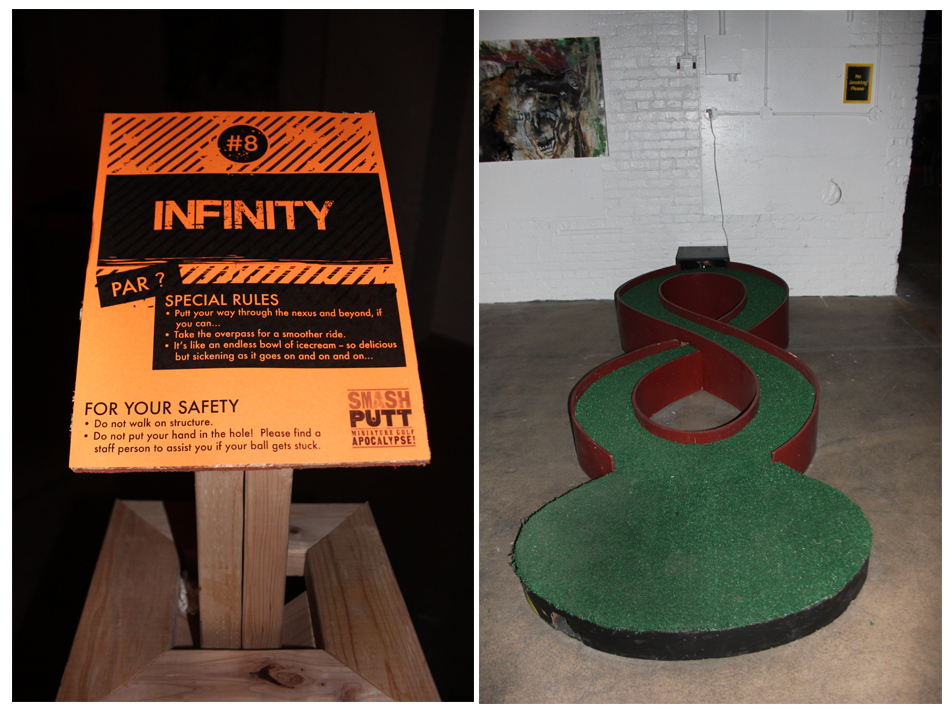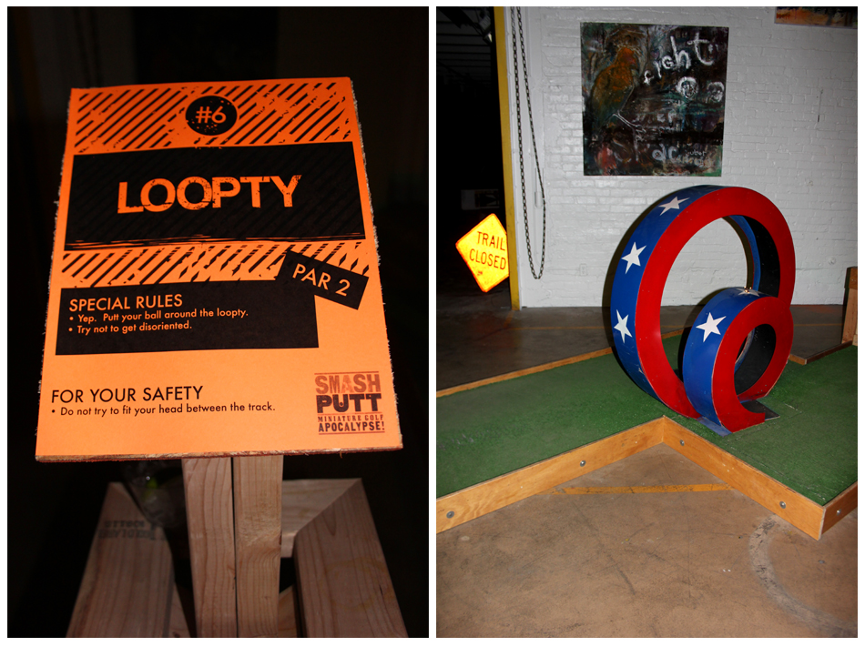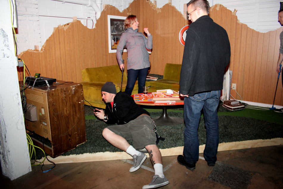 Miniature golf…with the spirit of mayhem, creativity, and good times with friends. “The art is the experience,” Smash Putt coordinator Jeremy Franklin-Ross said, attributing the work featured in the exhibit to “actors, artists, and nut jobs.” It’s not just a fun event but also one that supports good works. A percentage of all drinks purchased at the bar will be donated to three non-profit groups: The People’s Harm Reduction Alliance, Manifold Motion, and American Clothing Experiment.Smash Putt runs until February 26th at Fairways SODO. Visit the website here. Photos by Marcella Volpintesta.Published on January 9, 2012