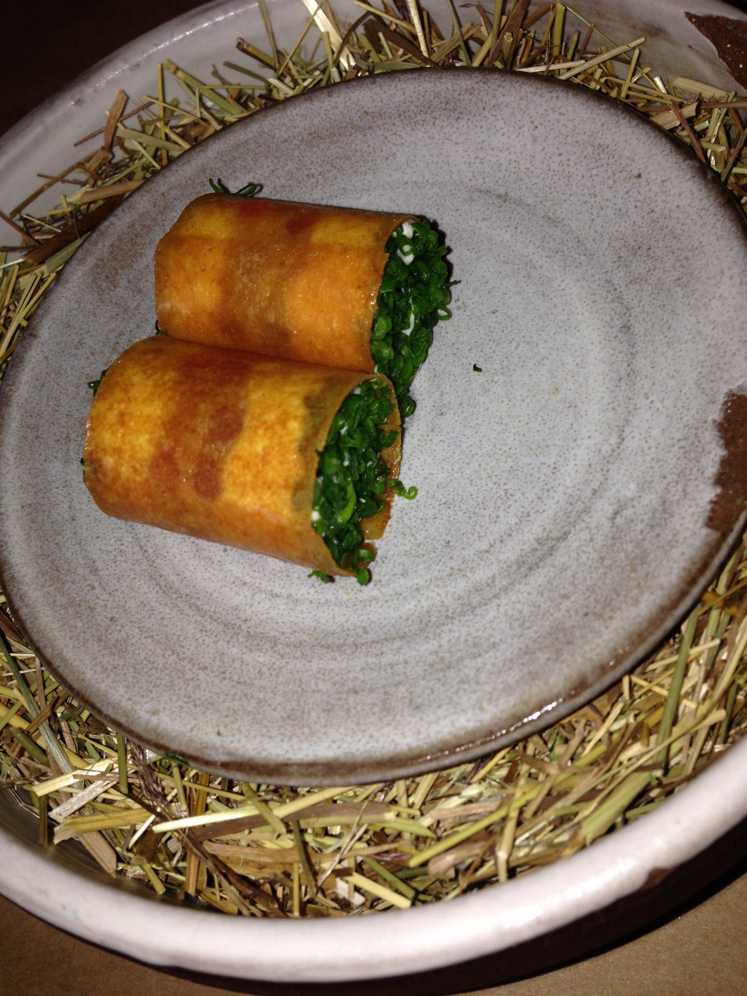 When we drive the short distance to the Inn for dinner, I’m both blissful and incredibly eager. We’re led into a bar area, though one that feels more like a handsome beach house’s living room, and seated next to another couple. We order drinks. Then a bowl of rocks—in which are nestled two deeply cupped shigoku oysters—is whisked before us. I’m not exaggerating when I say that the oyster I slurp down is the coldest, freshest, most delicately briny one I’ve ever eaten. It sets the tone for the rest of the meal.