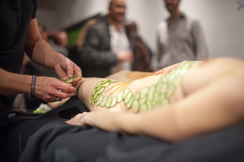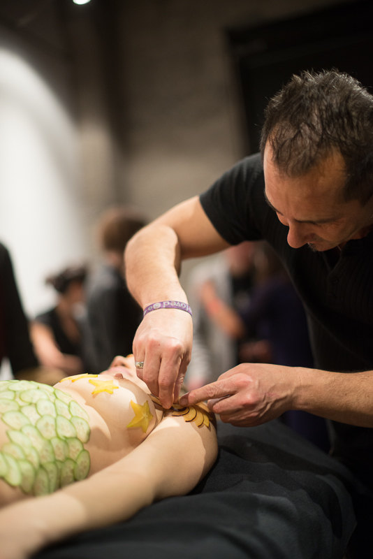 BlackRapid Studios invited photo buffs (and their friends) to a ValentineaE™s party involving models nearly in the buff to celebrate the opening of its new event studio and workshop on Lower Queen Anne. SeattleaE™s James Beard award-winning chef and aEœpleasure-activistaE Tiberio Simone created his one-of-a kind, live-model food art Saturday evening. The event also marked the release of “La Figa: Visions of Food and Form.” Photos by Stephen GiangPublished on February 11, 2013