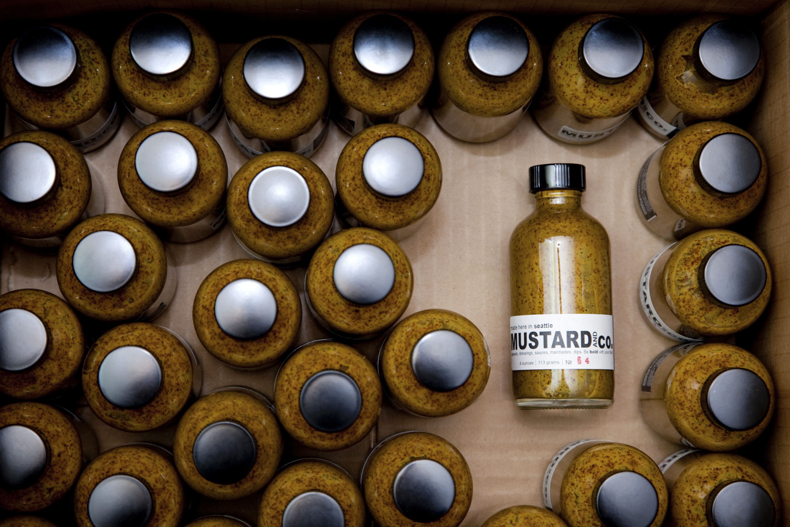 After that moment, it took about 15 minutes of intense Googling for Hoffman to become an “expert” in mustard-making. He got some seeds, spices, and balsamic vinegar, and went about making his first batch. After an hour of work, Hoffman had himself a product. For the next few years he continued to make his curiously dark mustard, using simple equipment, like an old Krups coffee grinder, to pulverize the mustard seeds into powder. The results were given to friends and family as gifts. It was a hobby—until he decided to move to Seattle.