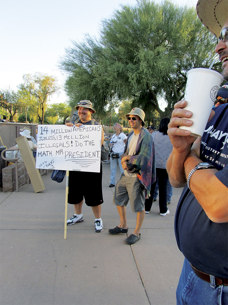 It was a hot day. People were sunburned. Some wore American-flag shirts, American-flag baseball caps, or American-flag necklaces. Some carried American flags. They stood in the sun to hear a lineup of speakers deliver the same victory-themed message: Americans are under siege by hordes of illegal invaders who steal their jobs and suck up public benefits . . . and, in this economy, how much more can Americans be expected to endure?