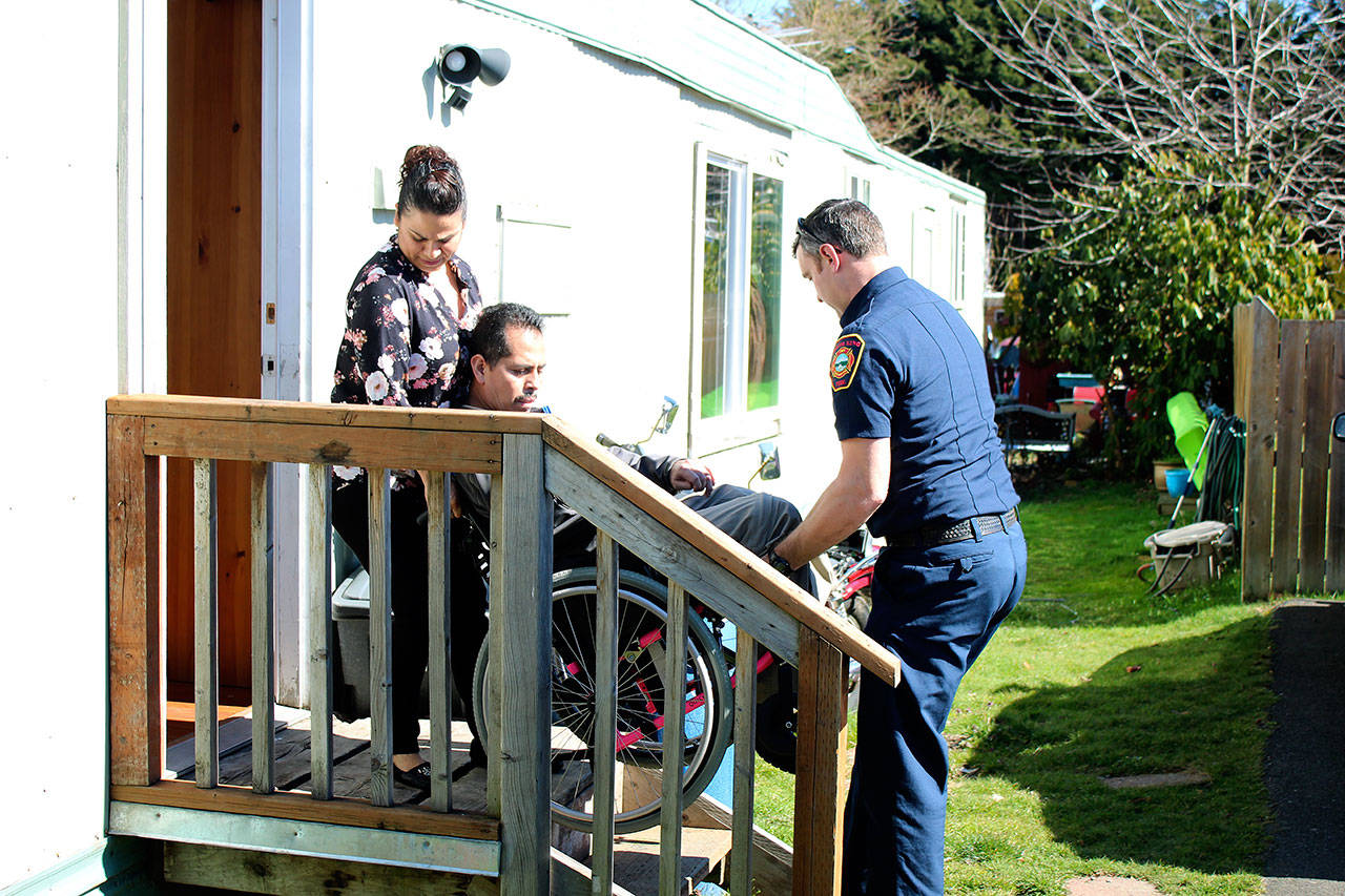 On a recent afternoon, SKFR Lt. Chaney and Rocio Barco picked up Bernardo Barco in his wheelchair to help him over the steps into their Des Moines home. It was the couple’s first time back at their house since the crash.