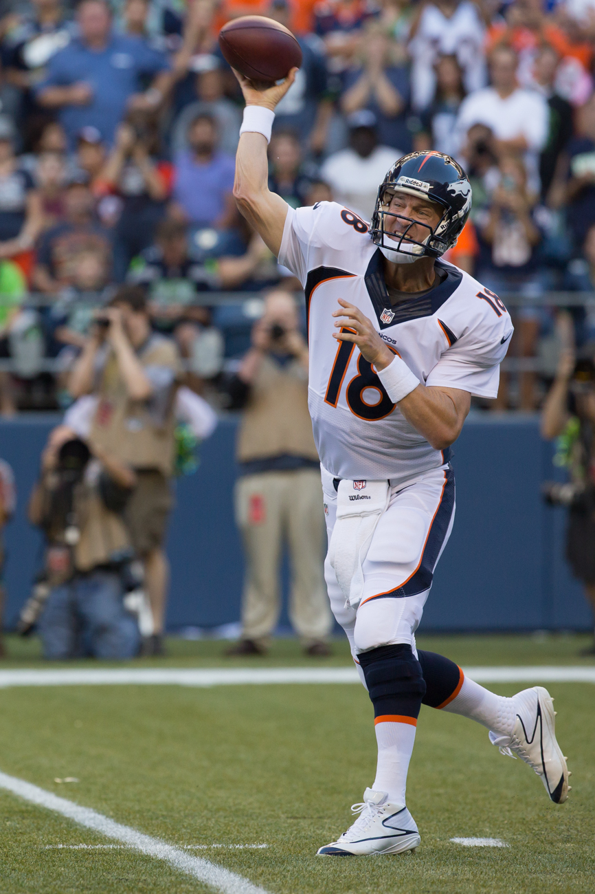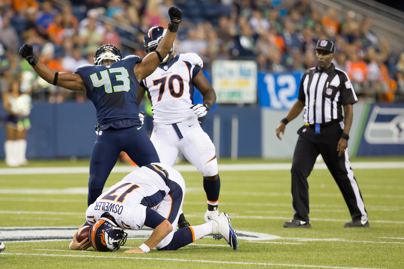 Seattle offensive line backer Kyle Knox exerts some dominance after sacking Denver second string quaterback Brock Osweiler.