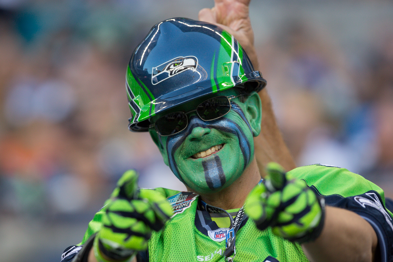 Self appointed super fan Bernie Hawk, who goes by Paul Gates Monday through Friday, is all smiles after another Seattle touchdown.